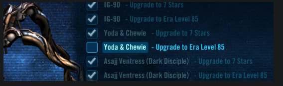 Slevin4424New Spectator1 day agoStatus: NewMaul event requirement bugI have a era level 85 yoda & Chewie- the maul event is not recognizing it
