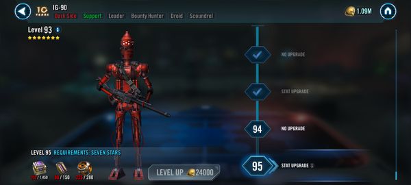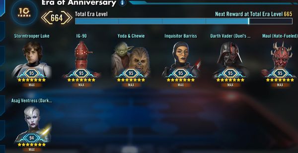 I have 45 zerek modules in reserve after finishing today's run of Vader's marquee tiers. I need 280 to take Luke to 95, 840 to take Barriss to 95, and 1,050 to take IG-90 to 95. That means I need 2,125 more zereks to finish taking each of the era toons to 95 to hit Era level 665.