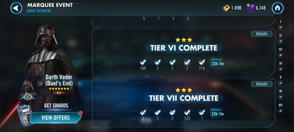 Vader's marquee is scheduled to run 2 more times, but you can only obtain 320 from tier 7, 210 from tier 6, 295 from tier 5, and 210 from tier 4 per day. That comes out to 2,070 total.