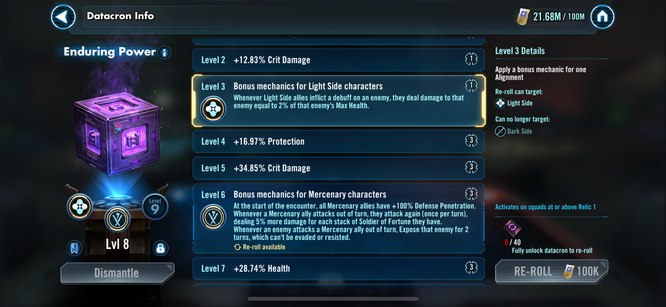 I had some materials saved up after the last conquest so that I could level up some more datacrons in case the next set didn’t fit the teams I needed them for.