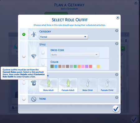 My Getaway visitor sims have all outfit categories set up in Customized Role Outfit from the Current Roles panel. I wanted them to wear the Formal custom outfit in the evening, so set Formal in Sele...
