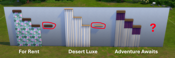 I have looked through all of Adventure Awaits buy mode and cannot find the curtain rod for the modular curtains included in the pack, like previous modular curtains have had in For Rent and Desert Deluxe. Please see the included image to better understand. The beam-like rod is missing? Maybe due to a tagging issue?