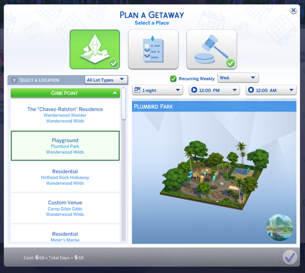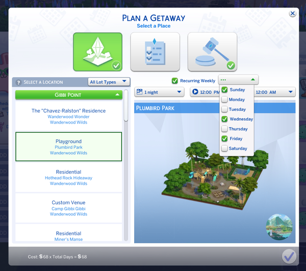 Here is the calendar, as you can see, the weekly recurrence did not get scheduled and as I expected, playing through just fast forwarding, I was never asked to enter the getaway besides the first initial time. I expect them to keep happening indefinitely based on the weekdays I picked. Wednesday, Friday, Sunday like how the festivals and stuff do.