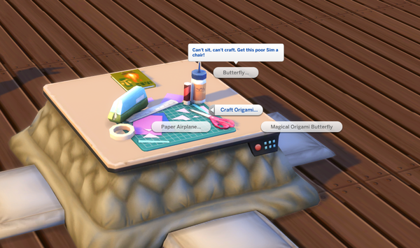 - All Origami Papercraft options are greyed out and unavailable. Error Message, "Can't sit, can't craft. Get this poor Sim a chair!"