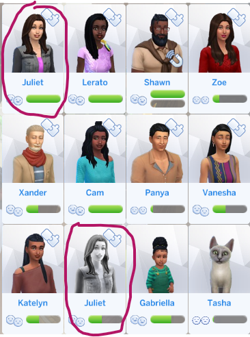 She also shows up in her mother's relationship panel twice (below), even though she wasn't (and still isn't) living with her mom when she used the perk for the first time. I forgot this bug existed and jumpscared myself, thinking she had died while I wasn't playing her.