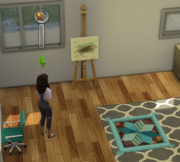 I delete the event easel and buy the regular one, which still doesn't fix the problem, though now she can walk over to the easel at least. I put it in her inventory and travel to the park in Willow Creek. the cell phone icon appears again and she glitches again. I debug her several times, then try to get her to put the easel in the world to paint. She takes two steps, freezes. I debug her again and repeat the process. She takes two steps, freezes. I delete the stupid cellphone icon again. She takes 5 steps and does the hand motion to pull something out of inventory... except the easel never appears in the world and she freezes again. I debug her twice more, then give up.