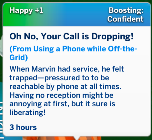 I'm not sure if it's the off-the-grid moodlet, but nevertheless bad reception moodlet I get pretty much every time my sims call someone. Happens regardless of lot, world, or sim. Most recently happened to an adult sim in Fashion District in San Myshuno. I'm using a pc and my game's set in Finnish (the translation might be a bit different which is why I'm not sure if it's the same off-the-grid moodlet).