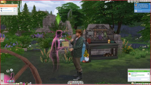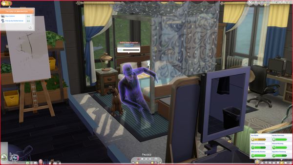 Also, oddest role replacement yet: Skillful Sleep projection. One of my characters with the Skillful Sleep perk is a ghost Johnny Zest. (he died of laughter on me, which was pretty fitting, so i rolled with it) It means his Sleep Projection is also a ghost, (i mean, they all appear as ghosts, but they're not actually) and so it has always shown up in a mod i use to let me be able to retrieve the urn of any ghost in the game. Sleep projections are clones of the sim at the time you first activate it, and when I did that, he had a different haircut. I was trying another hair out on him but he didn't feel like himself so i changed it back. His sleep projection kept the old hair though. So i was a bit surprised when his projection had his OG/current hair.