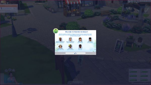 When playing in Henford on Bagley, I noticed that every NPC that comes with the pack (The Grocer, the Mayor, The Garden Stall Owner, The Pub Keeper, and the Creature Keeper) were doubled. Two sims with the job title above their names were appearing around the world. Both sims offered the errands, meaning my sim could complete two rounds of every errand from every NPC. Some of the duplicates were copies of the original NPCs, for example, the mayor, Lavina Chropa, had two versions of Lavina, both listed as Mayor, and both offering the same errands and rewards. Other NPCs had randomized townie versions and the original townies in Cottage Living, for example, the grocer sims were the original Kim Goldbloom, and a randomized townie just with the job title and offering errands. No complication arose from this, it honestly just allowed my sim to do more of the errands, but it does break the immersion a little when every NPC has a twin or is a completely different sim half the time.