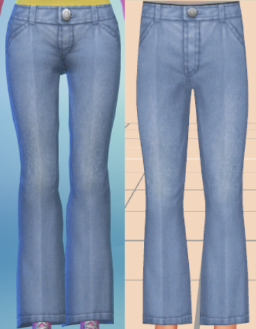 ymBottom_EP12JeansFlare , when worn on the female frame, caves in at the crotch and lowers the waistline, and the flares constantly clip. There's also some odd bulging around the thighs and knees.
