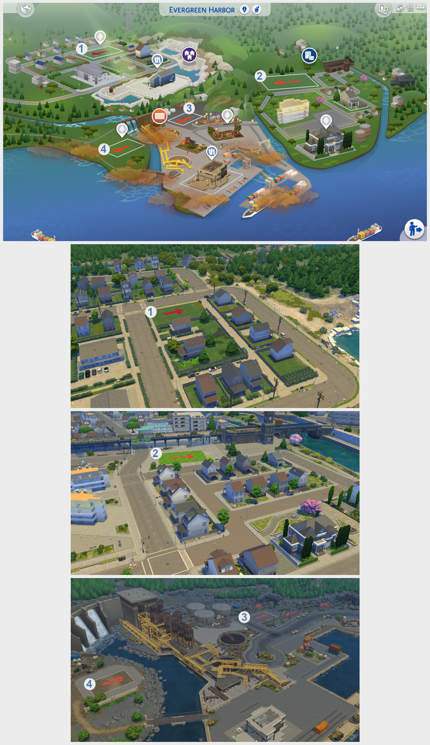 [Eco Lifestyle] In all three of the neighbourhoods in Evergreen Harbor, there is at least one lot rotated the wrong way. These lots are Miner’s Mansion (1), Sprucewood Square (2), The Caboose (3) and The Old Mill (4).