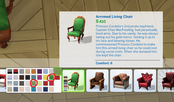 Small issue, but basegame's Arrrmed Living Chair has one extra, malfunctioning color swatch. The swatch looks forest green but then the chair turns out to be military green, and there are already other swatches for these two colors. The chair from this swatch looks identical to the forest green chair.