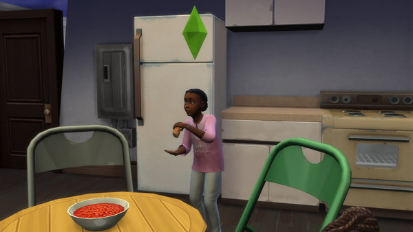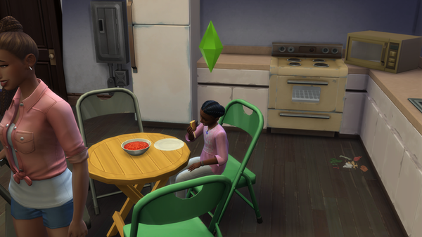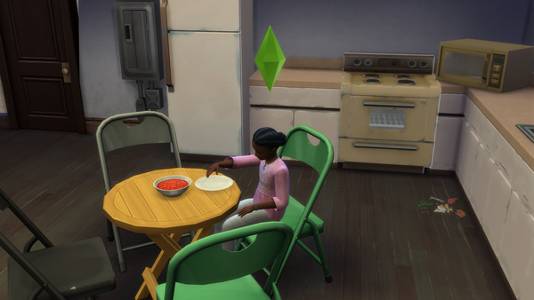 My sim autonomously grabbed a corn dog. The game crossed out the activity in the queue. The sim held an invisible plate, and then ate the corn dog, which appeared and disappeared again. When placed on the table, the plate reappeared.