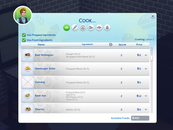 When cooking Corndogs, the recipe appears with a blank icon (red X placeholder), and upon completion, the food item is completely invisible. The invisible object temporarily blocks the cooking surface until save/reload, making the recipe completely unusable and wasting simoleons and Sim time.