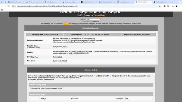 <report><version>2</version><sessionid>5a12e049dc23aa1669846028</sessionid><type>desync</type><sku>ea.maxis.sims4_64.15.pc</sku><createtime>2026-02-05 20:03:55</createtime><buildsignature>Local.Unknown.Unknown.1.121.342.1030-1.200.000.692.Release</buildsignature><categoryid>build_ladders_mixin.py:91</categoryid><desyncid>5a12e049dc23aa1669846028</desyncid><systemconfig/><screenshot/><desyncdata>Exception in <function buildbuy_session_end at 0x00007FF4AFF2FB00>, args: (468958090960767119,), kwargs: {} RuntimeError('Unable to acquire ladder data for objID 468958090961684634.') (RuntimeError: Unable to acquire ladder data for objID 468958090961684634.) Traceback (most recent call last): File "T:\InGame\Gameplay\Scripts\Server\routing\__init__.py", line 1151, in c_api_navmesh_fence_callback File "T:\InGame\Gameplay\Scripts\Core\sims4\utils.py", line 183, in wrapper File "T:\InGame\Gameplay\Scripts\Server\build_buy.py", line 1194, in buildbuy_session_end File "T:\InGame\Gameplay\Scripts\Server\objects\components\__init__.py", line 98, in wrapped_method File "T:\InGame\Gameplay\Scripts\Server\routing\portals\portal_component.py", line 163, in on_buildbuy_exit File "T:\InGame\Gameplay\Scripts\Server\routing\portals\portal_component.py", line 192, in _refresh_portals File "T:\InGame\Gameplay\Scripts\Server\routing\portals\portal_component.py", line 311, in _add_portals File "T:\InGame\Gameplay\Scripts\Server\routing\portals\portal_component.py", line 330, in _add_portal_internal File "T:\InGame\Gameplay\Scripts\Server\routing\portals\portal_data.py", line 538, in get_portal_instances File "T:\InGame\Gameplay\Scripts\Server\routing\portals\portal_data_build_ladders.py", line 30, in get_portal_locations File "T:\InGame\Gameplay\Scripts\Server\routing\portals\build_ladders_mixin.py", line 100, in _get_ladder_portal_locations File "T:\InGame\Gameplay\Scripts\Server\routing\portals\build_ladders_mixin.py", line 91, in _get_blocked_alignment_flags RuntimeError: Unable to acquire ladder data for objID 468958090961684634.rtim=0 Client Session Time: 4249.23 Num Save Errors: 0 Num Load Errors: 0 Current Game State: 0xbe7da869 Game Sub-state: 0xae03c339 LoadingScreenActiveFlag: 0 Origin Version: 13,631,0,6144 Modded: False SystemInfo: Windows 11 10.0.26200 GPU: NVIDIA GeForce RTX 3060 Laptop GPU nvldumdx.dll 32.0.15.9174, GUID: D7B71E3E-6660-11CF-2550-533A0EC2ED35 </desyncdata></report>