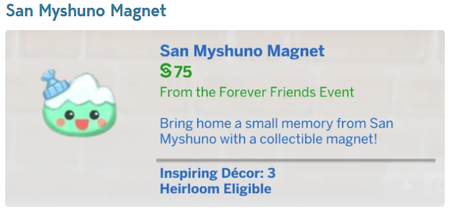 The Forever Friends event hasn't started, but there has been a leak of the rewards. One of the magnets is mislabelled... should be Mt. Komorebi or Yamachan (Town Mascot). Source: The Sims 4 For...