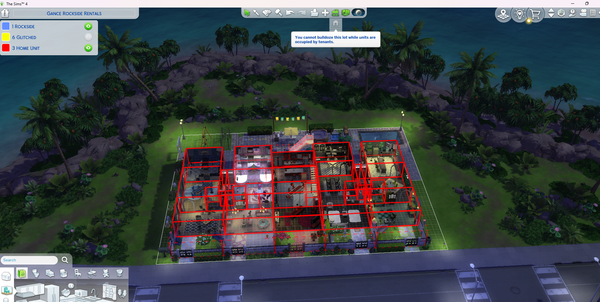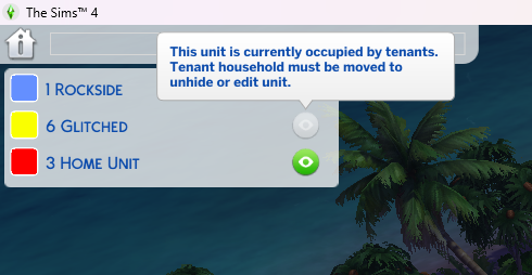 I added a new unit, deleted the unit, rebuilt the unit, renamed the unit, reassigned all the rooms to one, then reassign individually again. Tried to move someone in to try to evict, still nothing changes. Found something that seemed like it was an overlap of rooms, so deleted both of them and rebuilt and reassigned the units again. The yellow 6 Glitched remains in my list. I can rename the shared unit to the 6 glitch room, and tried to delete, but still could not cause it says it has a tenant. So I have to close out without saving to get my shared room back to shared because it won't allow deleting of anything that belongs to 6 Glitched, even tho there is no sim for that unit.