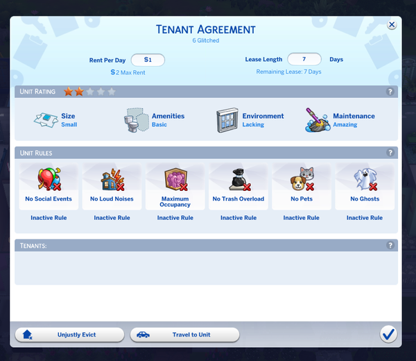 I wish I knew what I did or what happened to just one day, the second unit was saying it had a tenant but there was no one there, It doesn't show a tenant name and doesn't give me the option to fill vacancy because "a tenant lives there" it says. Nothing happens when I do the unjustly evict. When I travel to unit, it just takes me to the front outside of the whole building/lot and the sim stands there lost.I have tried so many things now, I am not even sure what I have done or not done. I think i had deleted the unit's rooms and tried to rebuild it, but ended up adding a 6th unit in it's place, still only being shown 5 actual units tho, but 6 units were shown in the menu.