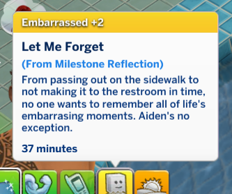 Both adult sims have milestone moodlets, but have never experienced those milestones. One has the Sting of Rejection (from Recalling a Milestone), the other has Hated and Sad About It and Bladder Blunder. I've checked both of their Milestone panels, and neither have milestones associated with these moodlets. I have also never seen these moodlets pop-up for either of them until today after updating the game.