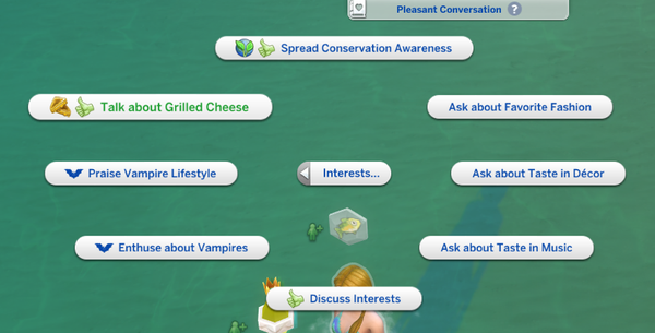 When you have an active club gathering, and the club has an activity to be friendly with others, the option to talk about grilled cheese appears under friendly > interests. The sim does not have the grilled cheese aspiration.