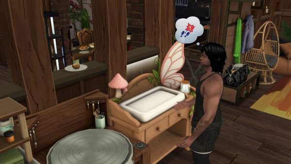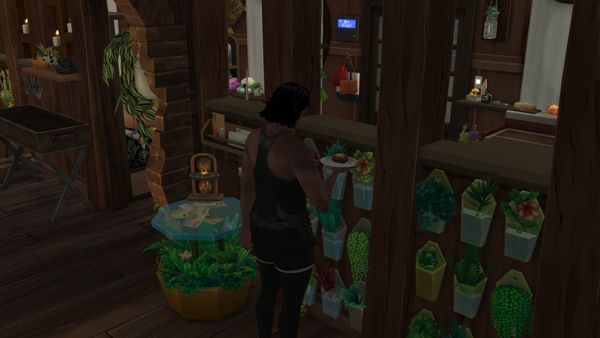 The sim had a plate in hand while I was occupied nearby and heard the sim drop the plate off on the half wall there. Then he changed clothing and just stood there. I checked his needs and he was still half hungry.