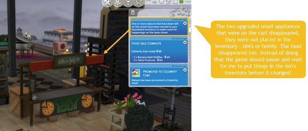 I just purchased the Home Chef Hustle SP. The Sim lives in a loft in San Myshuno in the Arts Quarter. I had the professional celebrity chef start a food sale with waffles and pizza. The game changed the setup in the Arts Quarter and moved the table into the family inventory and then deleted the food and small appliances. The appliances and food did not go into the family inventory, the sim inventory or into the fridge. I'm disappointed because I had the sim fully upgrade the appliances before selling food. This is a disappointing glitch.
