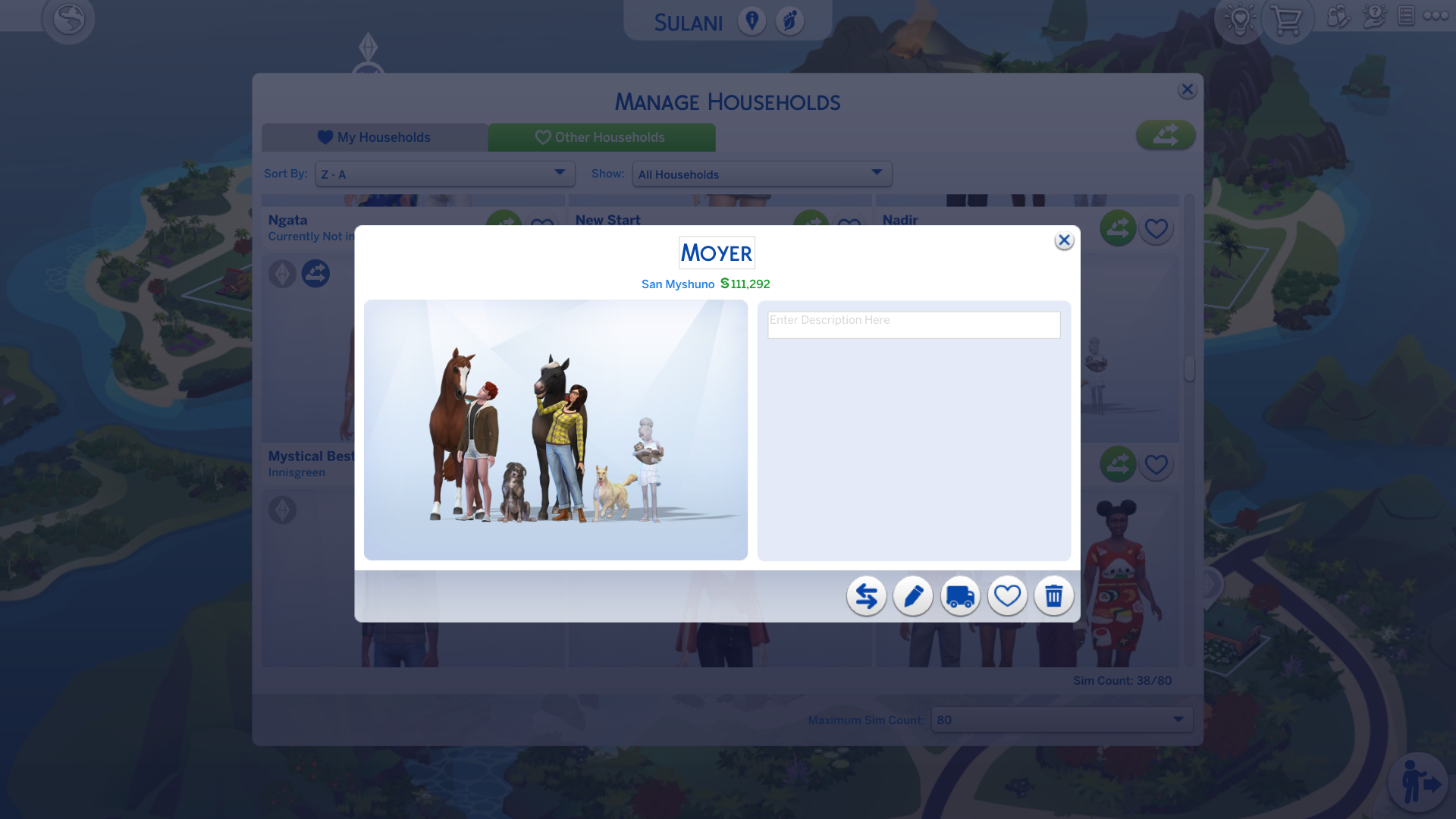 It will be worse if having Horse Ranch pack. I have seen (long time ago) households with 2–3 horses, especially this Moyer household. They live in a city apartment but have 2 horses, 2 dogs, 2 children, and 1 cat. See Screenshot (505). It is not realistic for Sims to keep horses in apartment, right??? I’m pretty sure this happens in others’ games too, see my post on X here and the quoted post. They make a joke about your broken game, have some shame maybe? Why is the program so poorly coded? Why not add a filter based on where they live?
