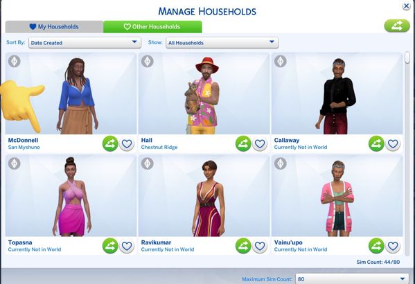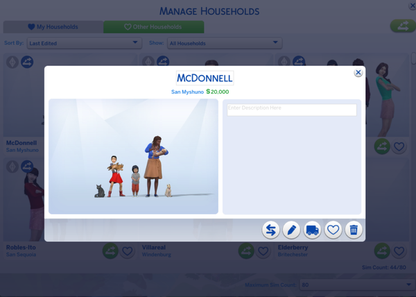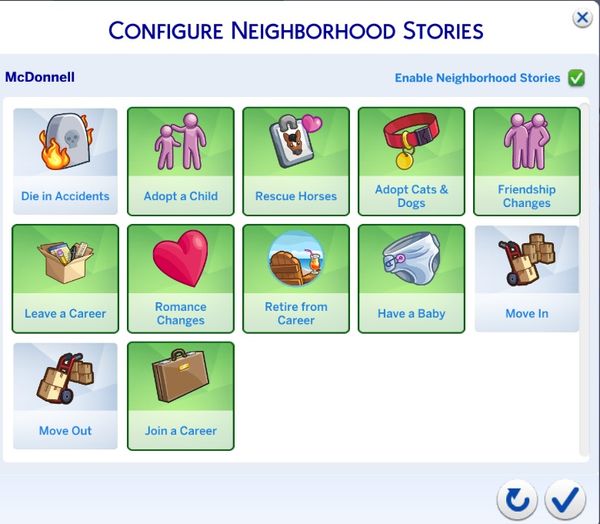 2. Open Manage Households and check the generated families. Enable Neighborhood Stories. I recommend turning off “death by accident” and leave the rest enabled. This way households will not be recycled, so the game continues generating them.
