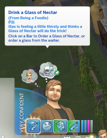 I'm probably the only player to see this as a problem since I play wants-based, but it just doesn't make sense that drinking the new nectar flavors that came with the Horse Ranch expansion pack doesn't fulfill the want to "Drink a glass of nectar", which is a want that frequently gets rolled when you play with a Snob or a Foodie sim. I'm pretty sure the vampire unlocked nectars doesn't work as well. I hope this gets fixed because it doesn't make sense that if my sim wants to drink just ONE glass of nectar, they have to own a whole bar or go out for just one drink, when they can just store bottles of nectars in their fridges.