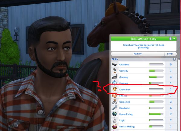 I never noticed this before, so I thought Endurance skill was for horses? Today one of my sims have reacheed lvl 1 in Endurance. When I point at the skill it gives info that relate to horses. Are sims supposed to get this, too? This sim has 4 horses and lots of riding experience, so I'd expect him to lvl higher than 1 if it was an intended skill.