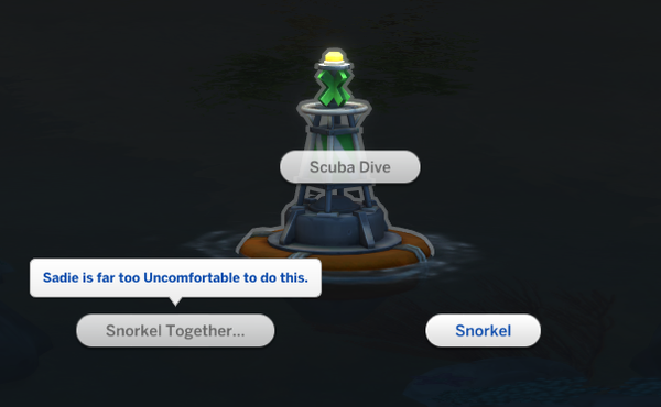 SproutLeeSeasoned Ace2 days agoStatus: Reviewed[IL] Snorkel Option Available when UncomfortableI just noticed that the option to snorkel is still available when a sim is really uncomfortable. All the other options are also greyed out.