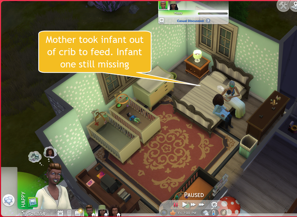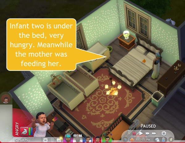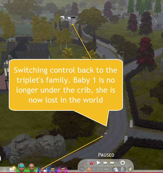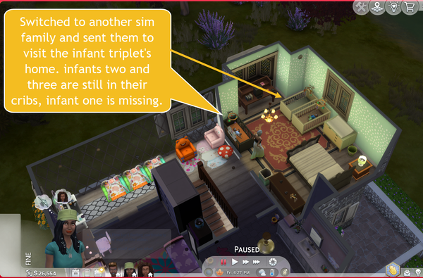 Pretty sure the parents placed the infants in the cribs, yet infant one is on the floor with her head under the crib. Infant two is in the middle of the street miles from home. And infant three is in the middle of the street miles from home. The parents are standing in the yard next to an empty rug with no infant.