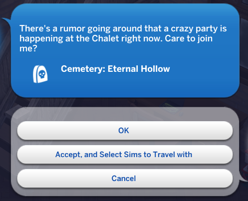 Hello sims team. I've also experienced this bug. I received this invitation. As you see in this screenshot, it shows that a party is happening at the Chalet (in Windenburg). But directly under that paragraph, the venue is differently stated as "Cemetery: Eternal Hollow" in Ravenwood.