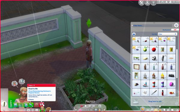 Heirlooms give Sims an Angry "Dead to me" moodlet whenever they view it, even though they had a good relationship with the deceased Sim, and also in the case they did not even know the deceased Sim. Emotions added to Wills also do not change this. This seems to happen from the moment the deceased Sim moves on, through for example Rebirth, or is released to the Netherworld. No mods.