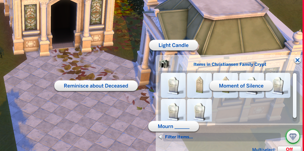 Am I stuck with these gravestones/urns, or is there any way to get them out of the crypt or be able to delete the crypts with the gravestones/urns in them? There's only so many urns/gravestones you can put in a crypt, and two of the crypts are legacy plays, and I don't remember these particular sims. So, I rather have the sims I remember fondly in there.