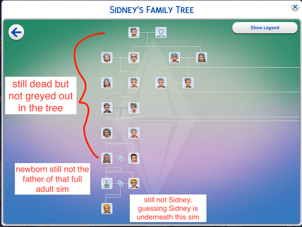 The dead-but-not-greyed-out sims is from a different bug, but included that for a full picture of the family tree issues.Mac, no mods.