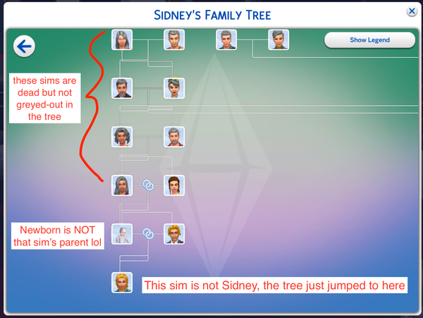 I opened up an older file that I played thru 11 generations just to test out the new family tree. It doesn't happen for all sims but sometimes I will select a sim and they disappear and the whole tree collapses.