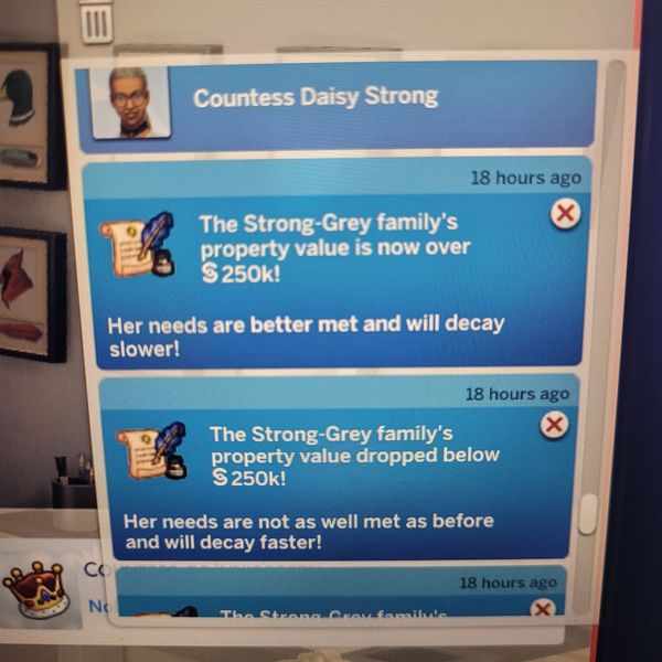 As of this comment the issue has resolved itself after spending time away from the home lot to allow one of the Regal Residence Moodlets to run out before another one started. Were the amount of notifications that popped up, not Moodlets as intended. I would get a notification that the value dropped below 250k then immediately get another notification saying it is over 250k a second later without me taking any action.