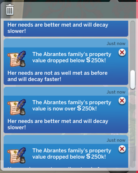The problem with the notification spam is that it appears to be bugged, occurring constantly even though your house (for example, in my case Verdemar Palace) is nowhere near being at risk of falling below 250K. And more than just notification spam, it causes the sims on the lot to lock up in a repeating set of happy and tense animations as the game thinks the lot is constantly reaching and falling below the 250K threshold when it actually isn't.