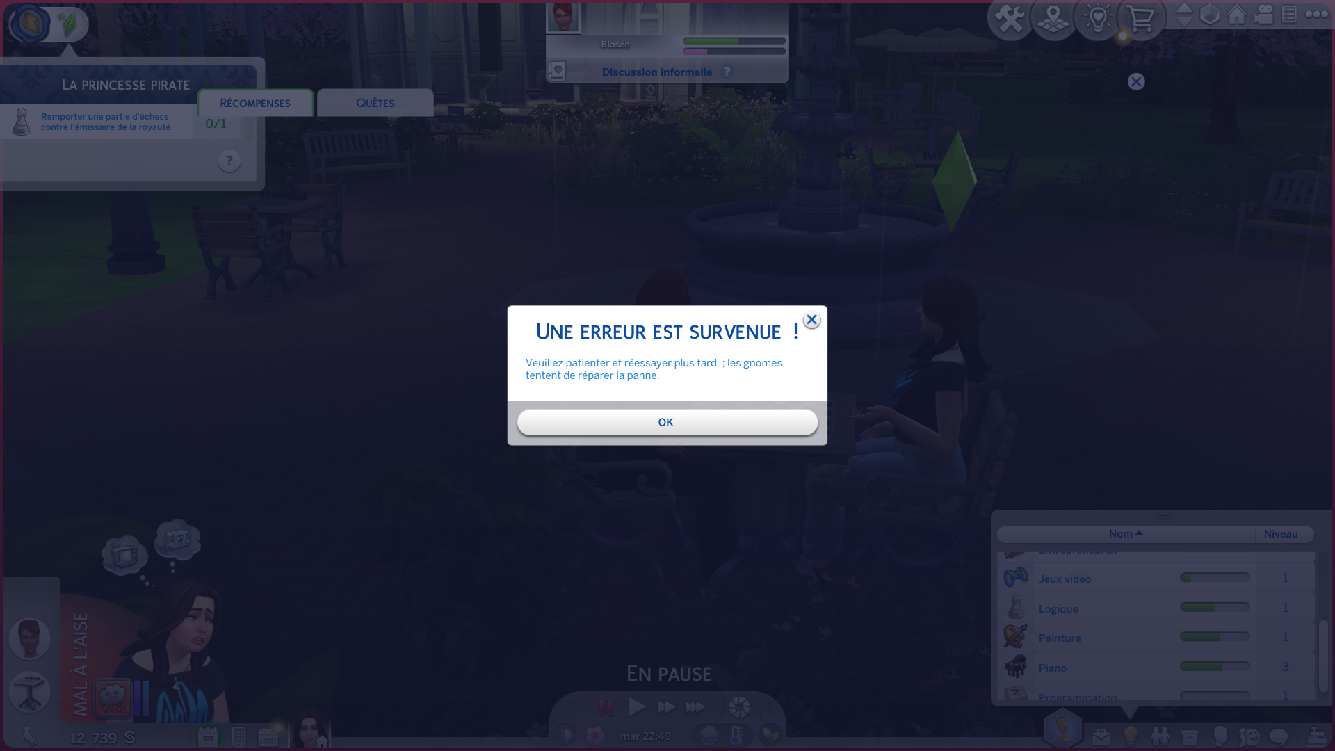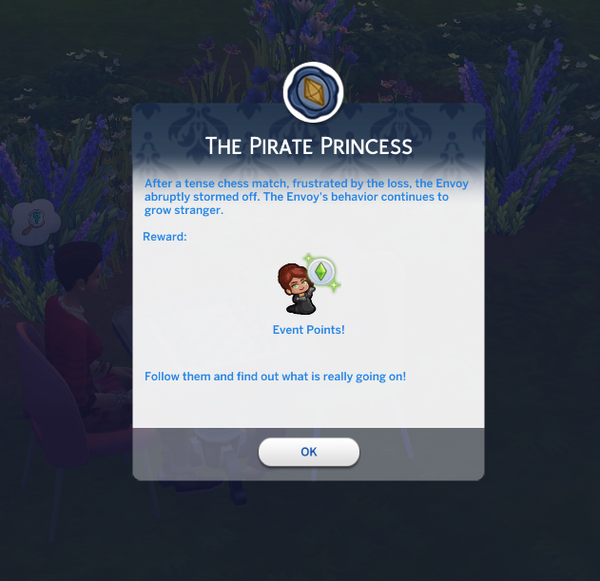 I was doing the current limited event. Now on the quest Pirat Princess. I was going to play chess with the royal lady but no one won the match it took forever. My sim had to leave to lot, but once I came back to finish the quest the lady was gone. I tried on other Households and other saves but she didn’t show up. Therefore my progress in the event has stopped.