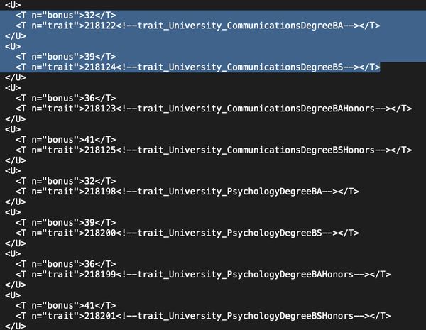 Distinguished psychology degree correctly boosts payment trait_University_PsychologyDegreeBSDistinguished degree in Communications gives a far lower bonus trait_University_CommunicationsDegreeBAtrait_University_CommunicationsDegreeBS (Regular degree in Communications, from Foxbury) gives higher bonus than Distinguished Degree in Communications from BritechesterThis also applies to the Honors degrees in the codeEdit: trait typo fixed in caption about Psychology degree.