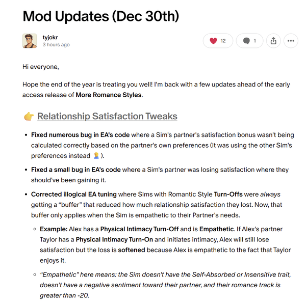 This issue was discovered by Tyjokr, a great modder who has been tackling the entire relationship system heavily and released fixes in many mods. The issue being reported here is specifically on how Relationship Satisfaction is being handled.