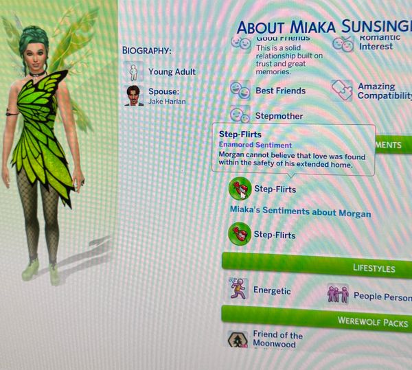 This is a problem that I have been dealing with for a while but hasn't realized what was happening. Now I am sure of it. Many of my sims serenade each other to the point of annoying and beyond. It just happens so often and quite frequently back to back. It doesn't matter where they are or who is around and they will even do it at their own wedding. Many times I have seen my sims with romantic relationships with friends, family members, or even random strangers standing around, and could not for the life of me figure out how the relationships were initiated. Recently my sims Morgan and Alaina were at the Romance Festival and Morgan's stepmother was also there. I made sure that Morgan spoke to her and did the whole friendly/affection/family kiss/family hug as I always have him do. So then the three of them start chatting and then per usual Morgan starts to serenade Alaina. My sims are vampires and usually can never stay still long enough for a full serenade, so Alaina ran off to do something, meanwhile Morgan continues the serenade because it takes a while for it to register that she is no longer there. I did not see anything pop up initiating a new romantic relationship in this instance, but it did. Their date ended and they went to their respective homes. As soon as she got home, it was late enough in the morning that she was able to call Morgan and invite him over so that she could ask him to move in with her. I don't remember why I was checking his family tree, but when I did I found the shared sentiment you see below. And it had to have been caused by the serenade multi-chat at the romance festival because it was not there prior to that.