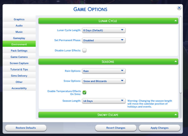 My lunar phase when I checked my calendar is not going through lunar phases. I checked my environmental settings and everything seems to be properly set. No mods or cc ever.