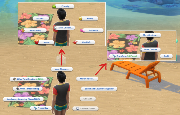 E.g. When using MC Command Center (Extremely popular) with Andrew's Pose Player (also still quite popular) then 3/8 slots of the pie menu options are already filled, as MC Command Center adds one interaction without a category that is always available and Andrew's Pose Player adds another 2. With those 3, only having a tarot deck in Sim 1's inventory, having traveled to a Sulani beach with Sim 2 and being a bit further away from Sim 2 would already trigger the bug. As we get 2 interactions from the tarot deck, the "Build Sand Sculpture Together" interaction from being on a beach/sand and the two "Call over" interactions, resulting in 9 interactions without a category in total.