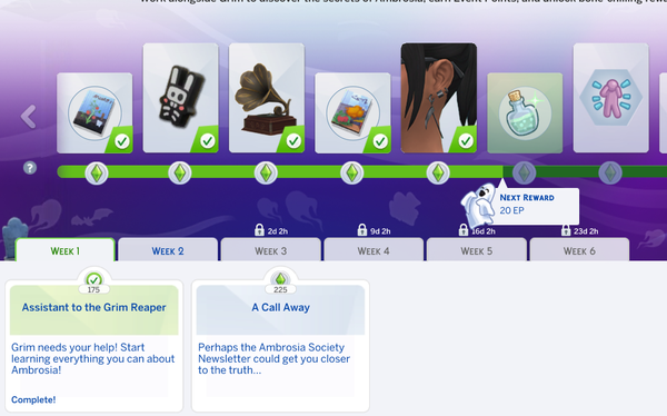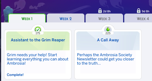 My game is updated, I've never used any mods, I've tried saving a backup and completely restarting my computer and the sims, nothing has worked. It says I've only completed week one, even though I got the Ambrosia Newsletter and purchased the Grimophone, I've even summoned him. The weekly tasks are also not showing up at the top left corner anymore, only the icon to pull up the event progress. This happened when I got other tasks to participate in holidays, advance my skills, etc. I saw another post that mentioned that's when this happened to them as well, so I believe it may have something to do with that. When I completed all of these tasks, the Grim tasks did not reappear.