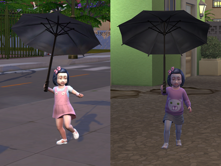Since 'Adventure awaits' toddlers in the game are using umbrellas when it rains. The umbrellas are the same size as those used by children and adults. But the toddler's arm always is distorted...
