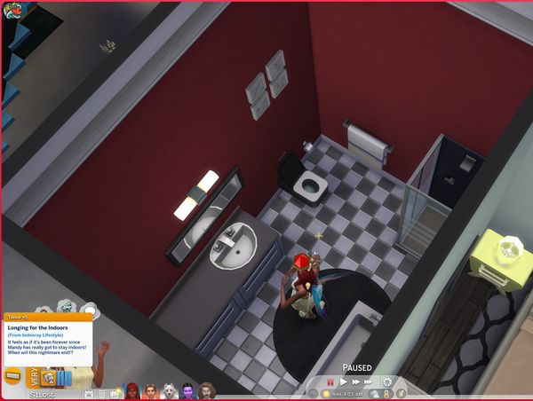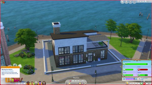 I have locked the gate on the Old Salt House and turned off freewill. This in turn gave my 5 sister sims the "Indoorsy", "Single and loving it", and "Close-Knit" lifestyles. They never leave the house and are all loner trait sims. Now Im stuck with this inaccurate Moodlet from the Indoorsy lifestyle. To combat this I tried having my fairy instantly fly over to the 3 trees on the right side of the first picture. No luck once back inside. I flew over to an electrical box and swiped a poster and went to a public toilet before going back into the house. No luck. When I reloaded the game later, they still had and held on to the inaccurate moodlet. One note I will make is each sister is a different occult and not all of them got the moodlet.