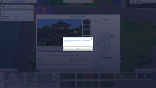 I can download lots just fine. Just can't upload my own lot to my gallery or save it as a new save. This happens both with and without mods. I've tried repairing my game. Everything. It still consistently happens after the most recent update. I really hope it gets fixed and yes, this is an entirely new save file. The last update corrupted my gave and I had to delete it. All mods were updated and broken ones were removed. I then removed mods all together and repaired my game. Deleted cache files and went into the game fresh cc/mod free. Tried uploading a base game lot to the gallery. "Server Error" popped up yet again.