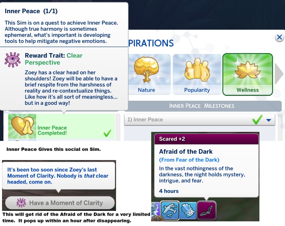 Now here's what I am seeing. see picture please... Zoey, cannot seem to get rid of it! She can make it go away with using the Clear Perspective trait earned by one of Wellness aspirations. I tried to keep a somewhat consistent time record to show that "afraid of the Dark" never disappears, no matter what I have her drink, except when I use the trait from the wellness.